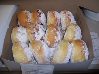 Today, Fat Tuesday, we celebrated by making over 1000 Loczkis at the bakery. The 'Loczki' is our low fat low calorie version of a paczki. We had Apple, Blueberry, Cherry, Lemon & Custard.